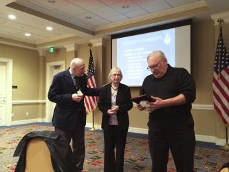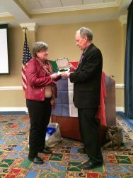 David Markham, President of the International Napoleonic Society, presents Ruth Godfrey with Jackson Sigler's INS Legion of Merit.